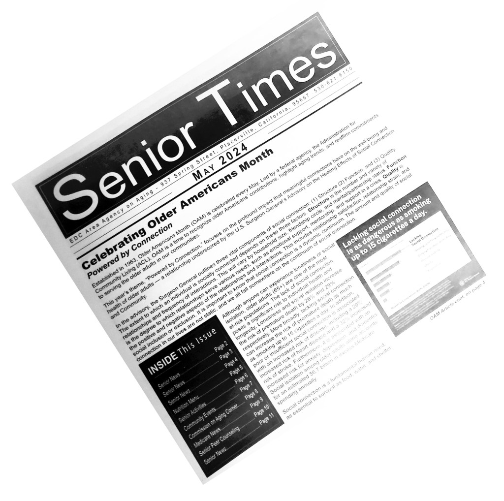 For a complimentary copy of the Senior Times, please call (530) 621-6150 or click on the links below to download. Please note: The downloaded version of the Senior Times does not include the Senior Nutrition Menu or the Senior Activities Calendar. For the Senior Times in its entirety, please subscribe at $5 for a yearly subscription and it will be mailed to you.